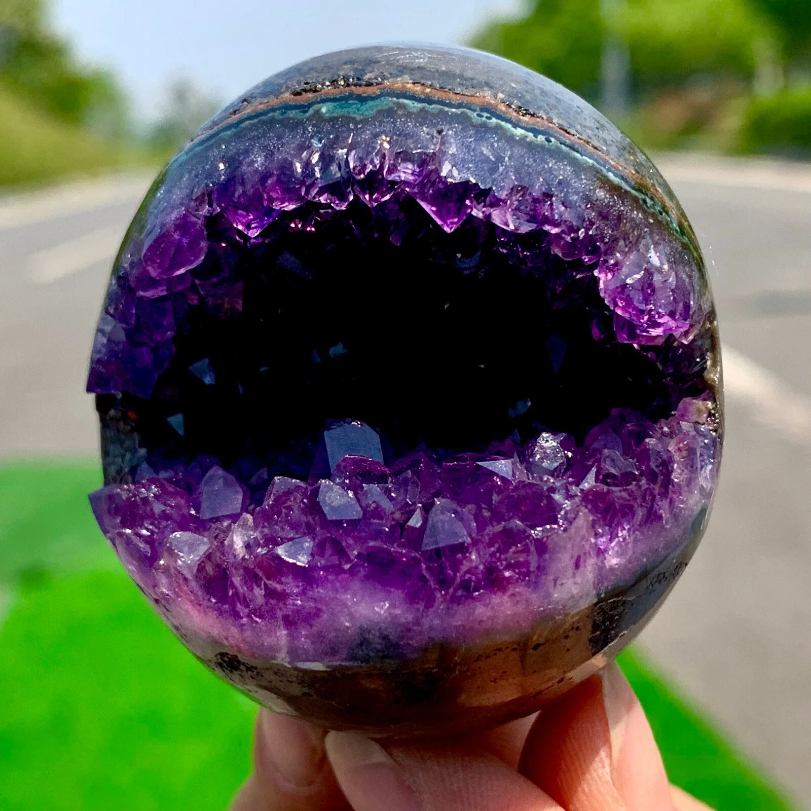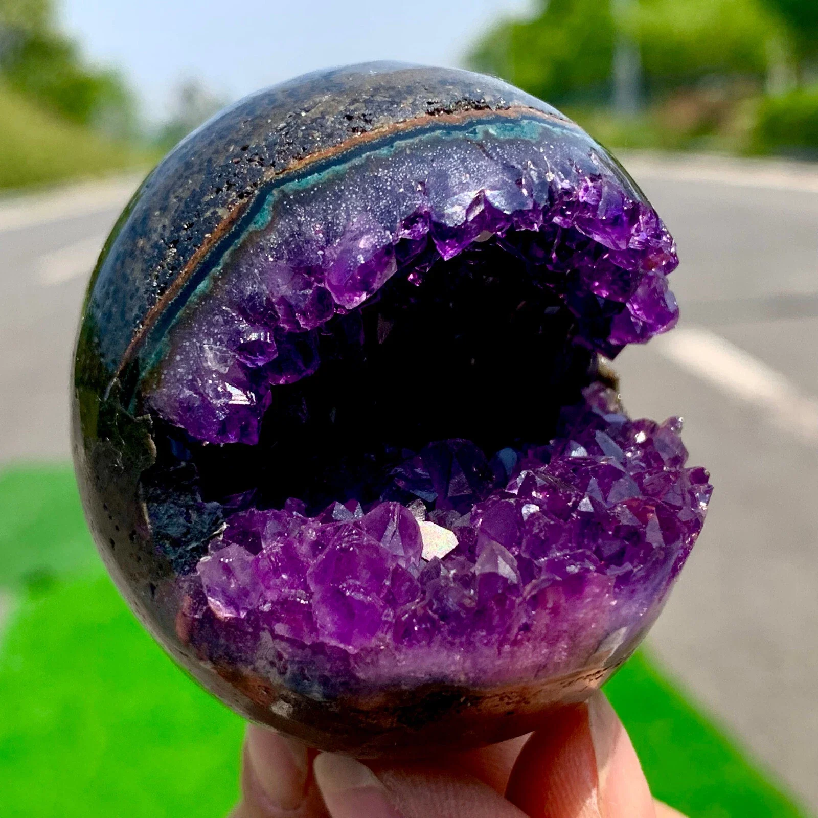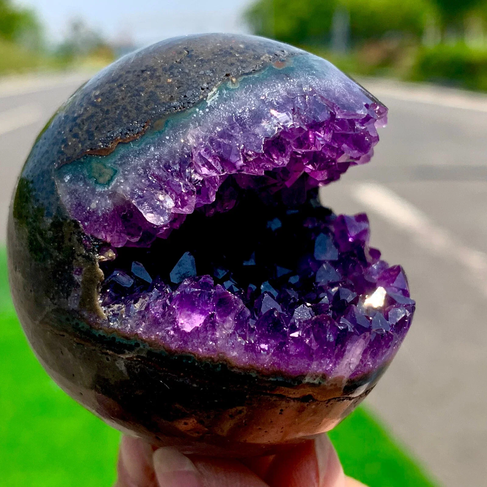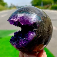 כדור אמטיסט חצוי ברמה יוצאת דופן, כל חתיכה מציגה תצורות גביש טבעיות, צבע סגול עמוק ומראה פראי שלא ניתן להתעלם ממנו.
